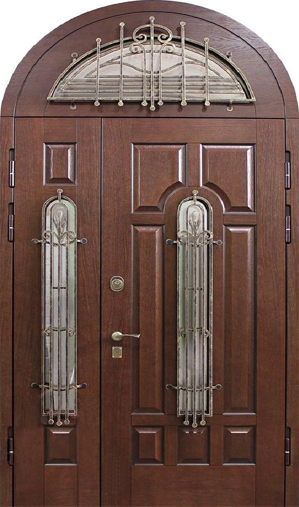 Арочные конструкции всегда придают входу выразительность и особый статус, а если добавить две створки и стеклянные вставки, дверь превращается в центральный элемент фасада. Натуральное дерево в отделке подчеркивает солидность и гармонично сочетается с металлом, из которого выполнено основание: каркас и полотно из профильных труб и стальной лист толщиной 2 мм обеспечивают прочность и долговечность. Для удобства и безопасности используются два замка разного типа — сувальдный и цилиндровый, оба с тремя ригелями, что делает взлом крайне затруднительным. Двухстворчатая арочная дверь со стеклом в частный дом №14 может изготавливаться любого размера и адаптироваться под архитектуру конкретного здания. Возможна установка дополнительных элементов: зеркало, стеклопакет, кованые детали или даже видеодомофон. Резиновое уплотнение по двум контурам защищает от сквозняков, а возможность выбора отделки и фурнитуры открывает простор для индивидуального дизайна. Двухстворчатая арочная дверь со стеклом в частный дом №14 от производителя: быстрое изготовление и монтаж в Лобне, индивидуальные размеры, широкий выбор материалов и фурнитуры, официальная гарантия до 10 лет.