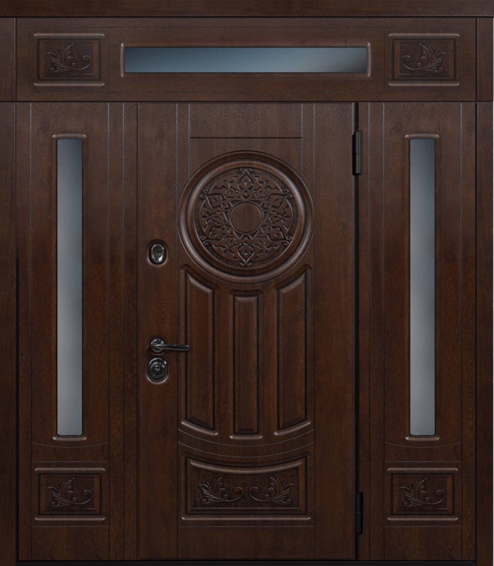 Эта нестандартная парадная дверь с фрамугой №6 — отличный выбор для тех, кто ценит элегантность и долговечность. Внешняя и внутренняя отделка из МДФ придает дверям стильный и современный вид, а также защиту от механических повреждений. МДФ устойчива к царапинам и вмятинам, что делает дверь идеальной для долгосрочной эксплуатации. Каркас из профильной трубы 50х25 мм и лист металла толщиной 2 мм обеспечивают прочность и надежность, а ребра жесткости из профильных труб гарантируют дополнительную устойчивость. В двери установлены блокираторы, два контура уплотнителей из резины, что повышает звуко- и теплоизоляцию. Замки от известных производителей, таких как Просам и Мосрентген, обеспечат надежную защиту. Возможность комбинировать отделку, добавлять зеркало, стеклопакет или кованые элементы позволяет легко адаптировать дверь под любые предпочтения. Нестандартная парадная дверь с фрамугой №6 от производителя: быстрое изготовление и монтаж в Лобне, индивидуальные размеры, широкий выбор материалов и фурнитуры, официальная гарантия до 10 лет.