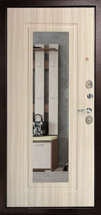 Прочный стальной каркас, лист металла толщиной 2 мм и система блокираторов делают эту модель надежным барьером для квартиры, офиса или частного дома. Внешняя поверхность покрыта молотковым напылением, устойчивым к механическим повреждениям и перепадам температуры, благодаря чему дверь сохраняет аккуратный вид долгие годы. Внутренняя накладка МДФ добавляет уюта и гармонично сочетается с интерьером прихожей. Зеркало на полотне выполняет не только декоративную функцию, но и делает пространство визуально шире. Зеленая входная дверь в квартиру №2 комплектуется двумя замками российских производителей — сувальдным Просам и цилиндровым Мосрентген, каждый из которых оснащён тремя ригелями. Два контура резинового уплотнения помогают минимизировать сквозняки и шум, а возможность выбрать сторону и тип открывания делает установку максимально удобной. При необходимости отделку, замки и дополнительные элементы можно адаптировать под индивидуальные требования. Зеленая входная дверь в квартиру №2 от производителя: быстрое изготовление и монтаж в Лобне, индивидуальные размеры, широкий выбор материалов и фурнитуры, официальная гарантия до 10 лет.