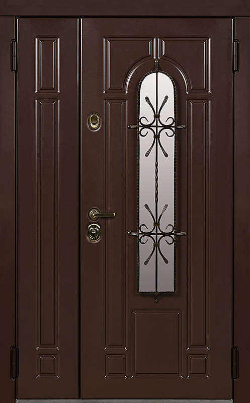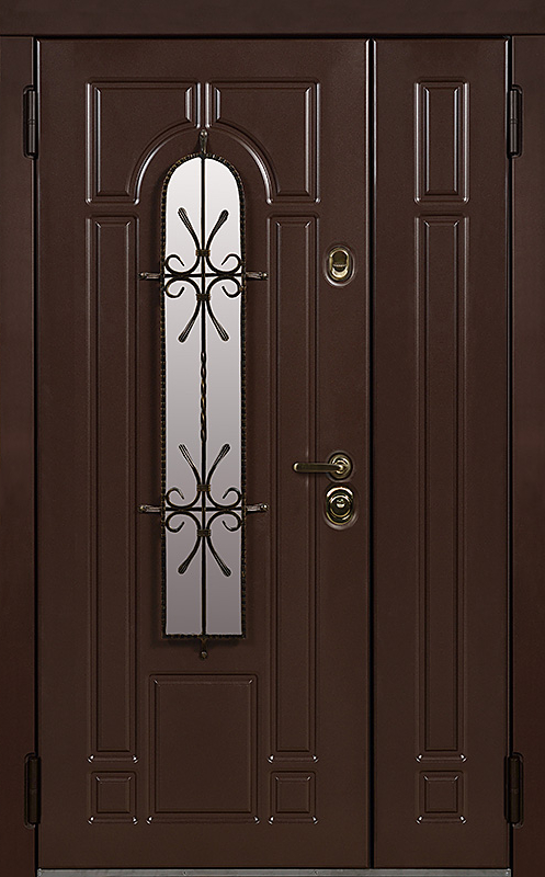 Эта металлическая двухстворчатая дверь с арочным стеклопакетом №15 представляет собой идеальный баланс между эстетикой и прочностью. Арочное стекло добавляет в её дизайн утончённость, а ковка в декоре придаёт изысканный, но в то же время крепкий и надёжный вид. Плита МДФ, используемая как для внешней, так и для внутренней отделки, не только сохраняет прекрасный внешний вид, но и устойчива к механическим повреждениям. Металлическая двухстворчатая дверь с арочным стеклопакетом №15 от производителя: быстрое изготовление и монтаж в Лобне, индивидуальные размеры, широкий выбор материалов и фурнитуры, официальная гарантия до 10 лет.
